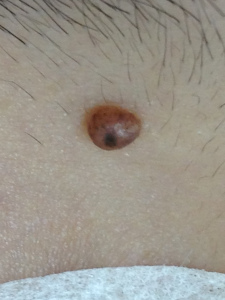 后天的結合痣會隨時間由原先的平坦變成輕微突出的半球狀,表面平滑,由于更深入往下生長至上真皮層,因此顏色會變為膚色或者棕黑色,且因黑色細胞活性降低,惡性變化几率也低。