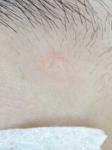 二氧化碳激光脫墨之後:墨痣內的黑色素已經被激光完全清除去掉。傷口被激光照射之後已經即時止血,傷口沒有黑色結焦,因此可以清晰見到傷口底部沒留下任何黑色素。因此此墨痣翻發的機會極低。此傷口齊整,也不很深,因此嚴重疤痕形成機會不大。當然,最終的皮膚癒合,有無疤痕,及疤痕屬於增生性或萎縮性,則要視乎患者的體質/膚質而定。