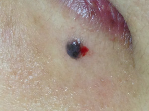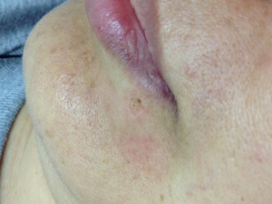 激光脫墨前。位於下唇左下方的一粒墨痣。剛剛打過麻醉針,針孔有少少血,很快就停止了。