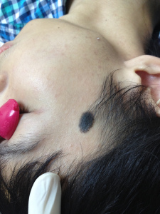 激光前:巨大的胎記長在右邊的太陽穴。面積太大,不能以手術整塊切出來。