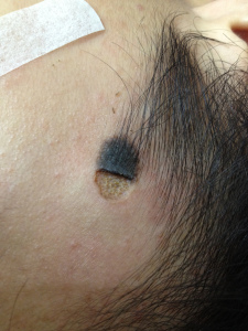 分段式激光去除胎記/胎痣:以激光去除一半胎痣,這樣可以減少疤痕形成。傷口可見是十分之深的。