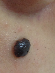 近鏡觀察該粒墨痣的形態。體積頗大,必須用激光去除以減少疤痕風險。