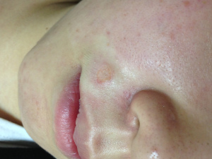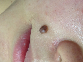 激光脫墨前。位於右邊上唇對上的一粒中至大型墨痣。體積頗大,必須用激光去除以減少疤痕風險。
