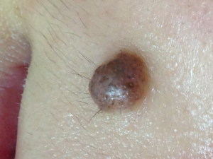 近鏡觀察該粒墨痣的形態。體積頗大,必須用激光去除以減少疤痕風險。