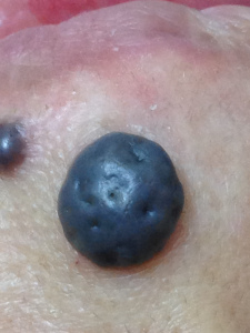 近鏡觀察:此等巨型墨痣屬於良性。可以用激光徹底去除。